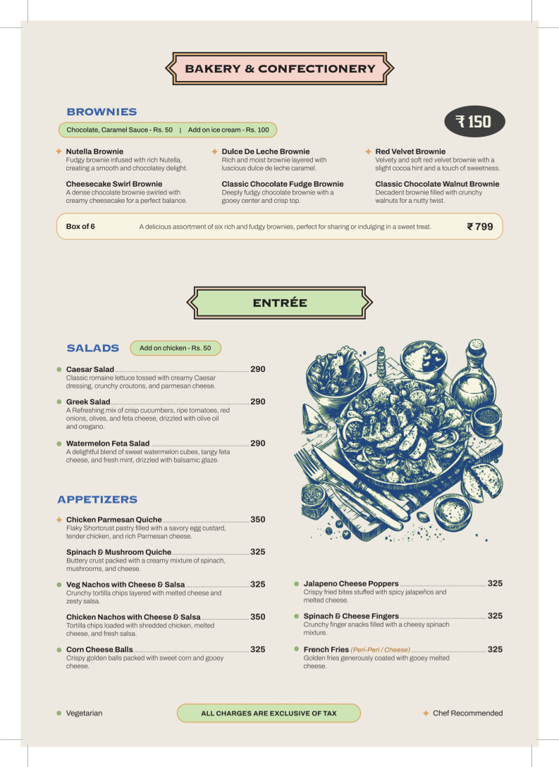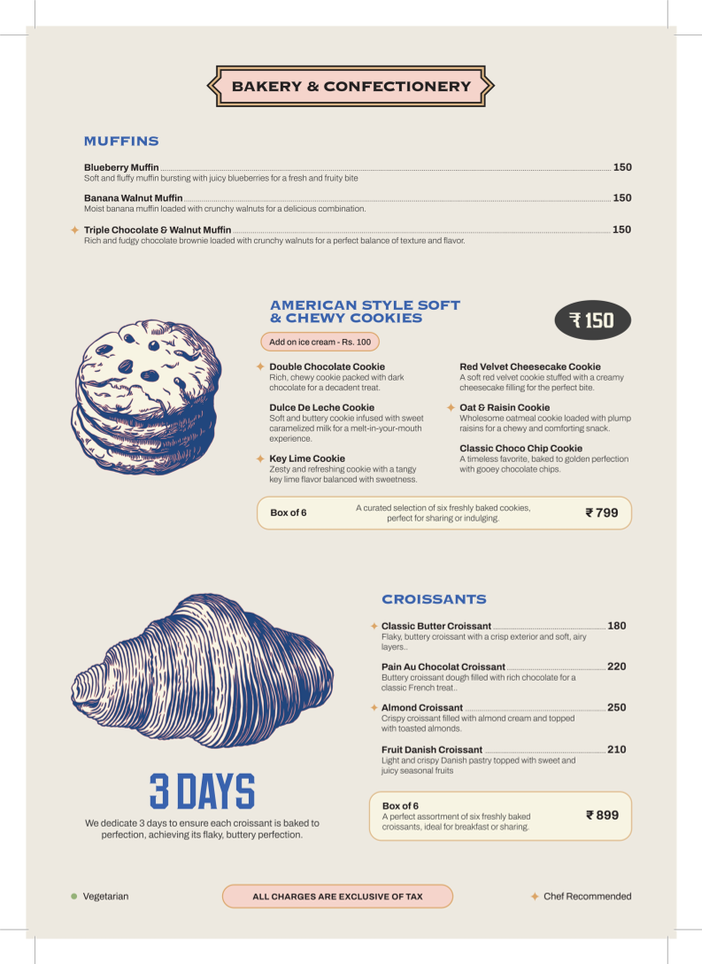- Muffins: Indulge in the soft and fluffy Blueberry Muffin or the moist Banana Walnut Muffin, each priced at ₹150.00.